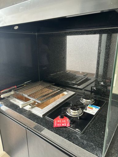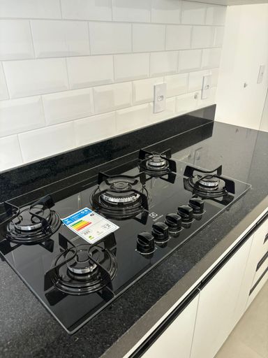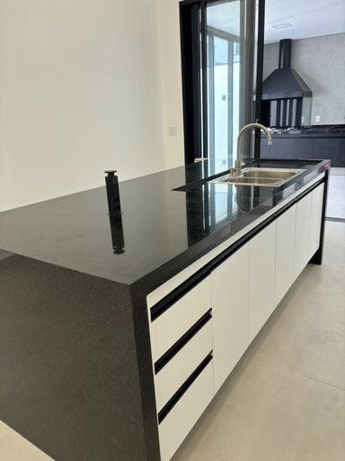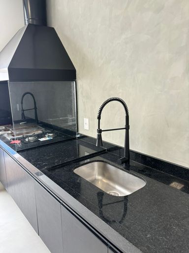 Cozinha e espaço gourmet com planejados, cooktop, pias Tramontina e granito São Gabriel;