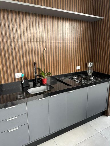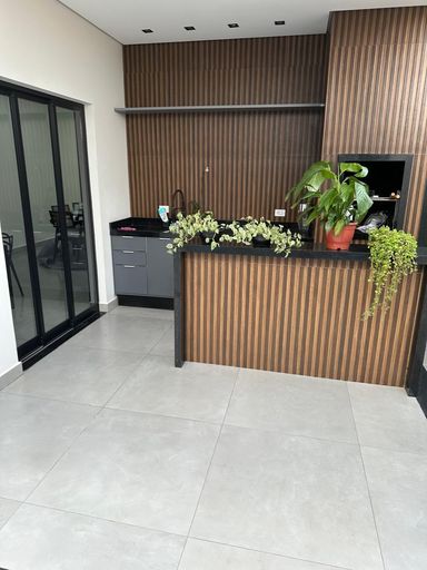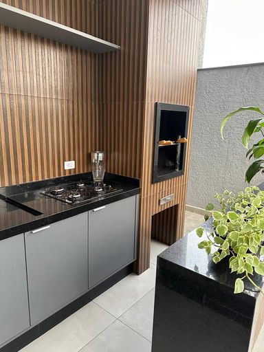 Espaço gourmet com planejados e fechamento com portas de correr